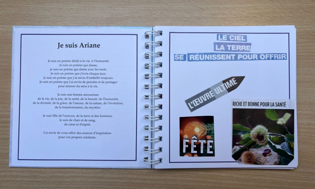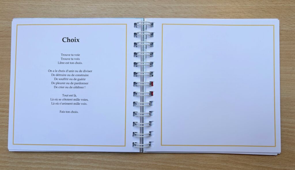 Les pages de couvertures sont cartonnées, les pages intérieures de bonne qualité. Sur la page de gauche est écrit un de mes poèmes, la page de droite est vierge, prête à accueillir vos propres tracés.