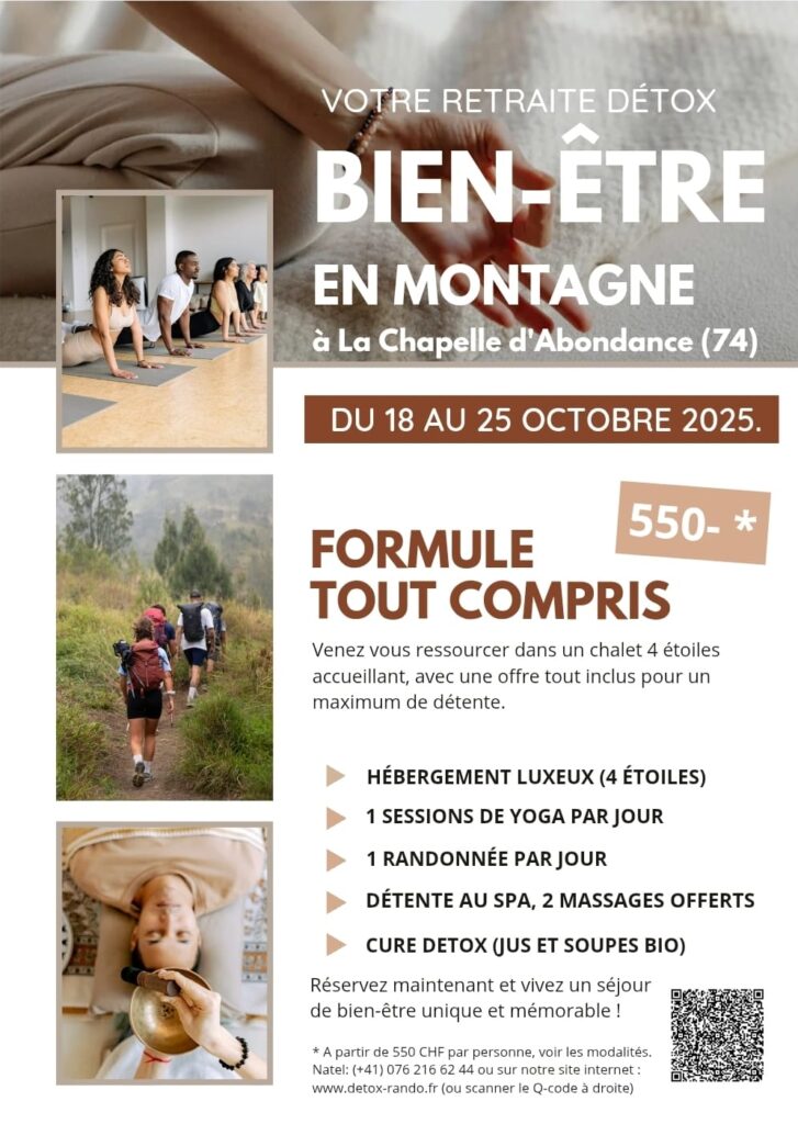 👉 Tarif : 550.- tout compris : hébergement, yoga, randonnées, détox gourmande (jus et soupes), conférences, 2 massages.